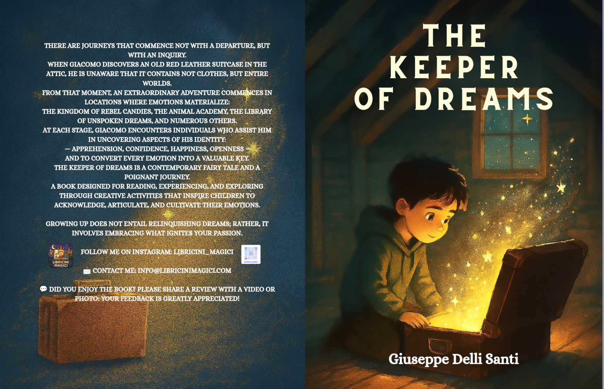 Il custode dei sogni è un libro illustrato per bambini (e per adulti con il cuore aperto) che racconta la storia di Giacomo, un giovane esploratore che scopre una valigia misteriosa nella soffitta della nonna. Da quel momento, viene trasportato in mondi fantastici dove ogni incontro è una prova, ogni oggetto è un simbolo, e ogni errore è un seme di crescita.